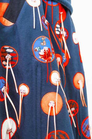 Der Stoff wurde komplett ringsherum mit vielen unterschiedlichen Kreisen appliziert, die mit Kordelstoppern und Ripsbändern geschmückt sind. Unterschiedliche Breite der gestickten Umrandung und kleine gestickte Punkte sorgen dabei für extra viel Dynamik.