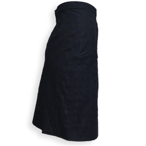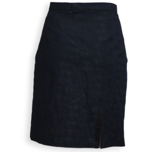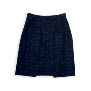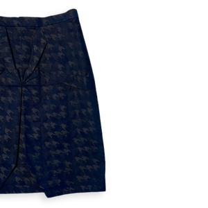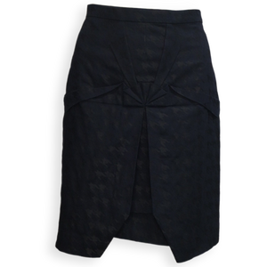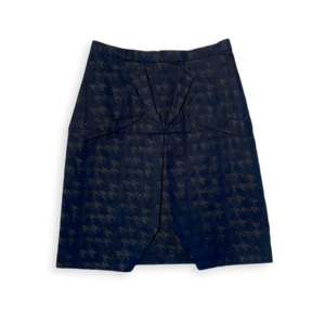Ein geometrischer Rock aus japanischem Denim mit raffinierter Origami-Faltung vorne und geometrischer Nahtführung im Rückenteil.