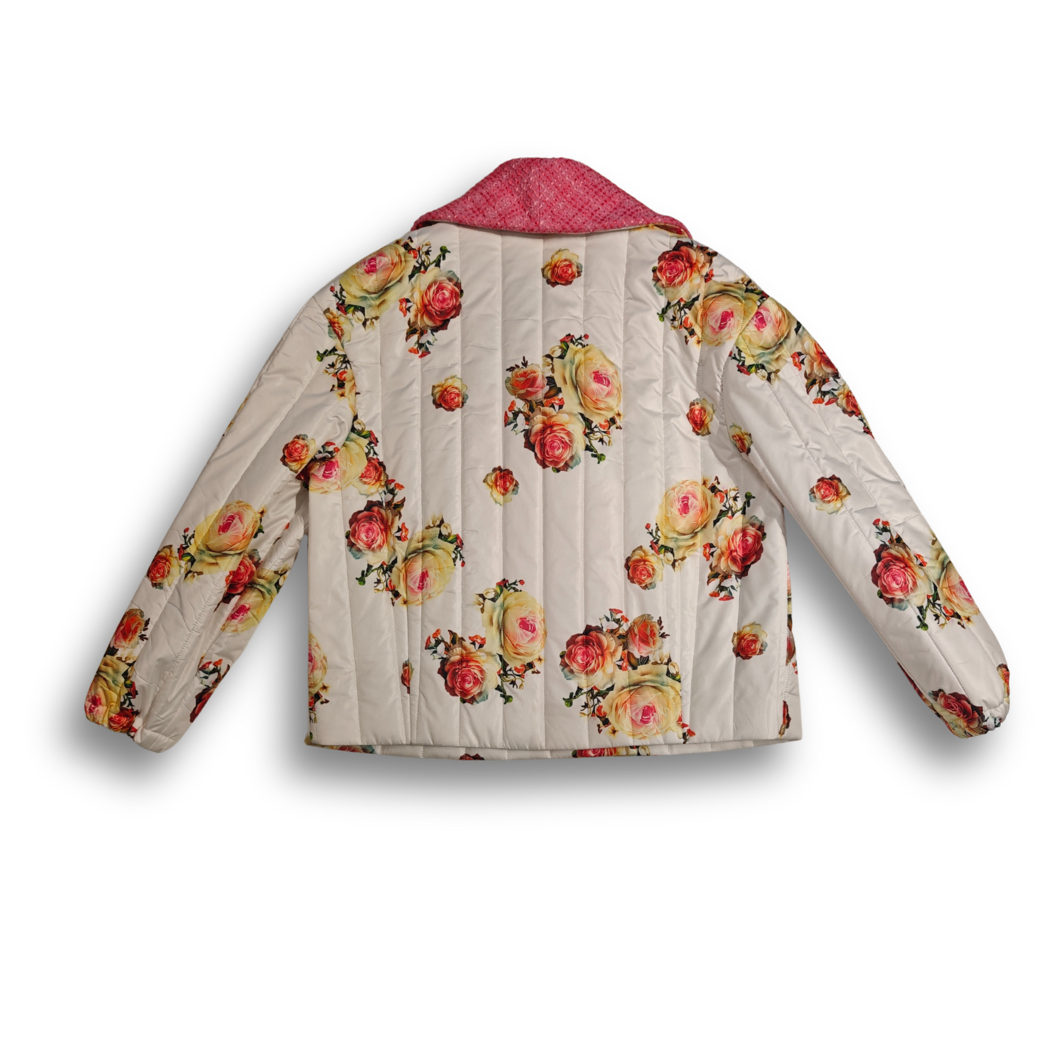 Leicht wattierte Kastenjacke mit einem großflächigen Rosenprint und einem Schalkragen aus Bouclé-Stoff.