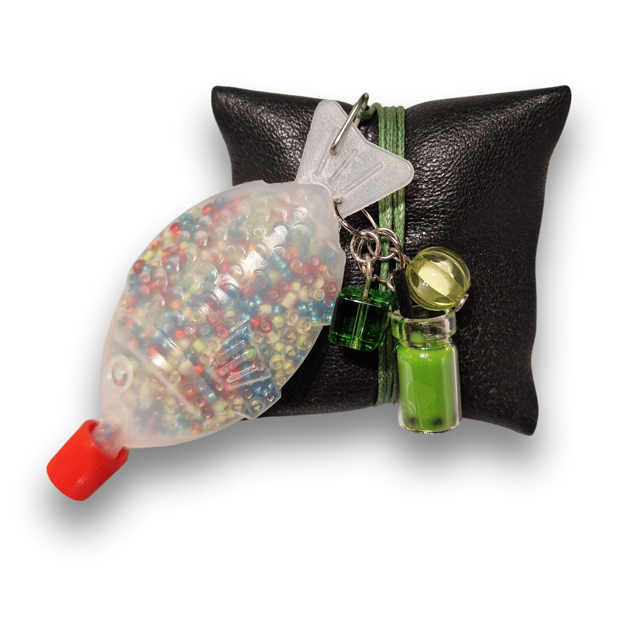 Sushi-Fisch mit Rocailles-Perlen gefüllt und Charm-Anhängern geschmückt. Das beschichtete Baumwollbändchen ist größenverstellbar (ca. 32-70cm).