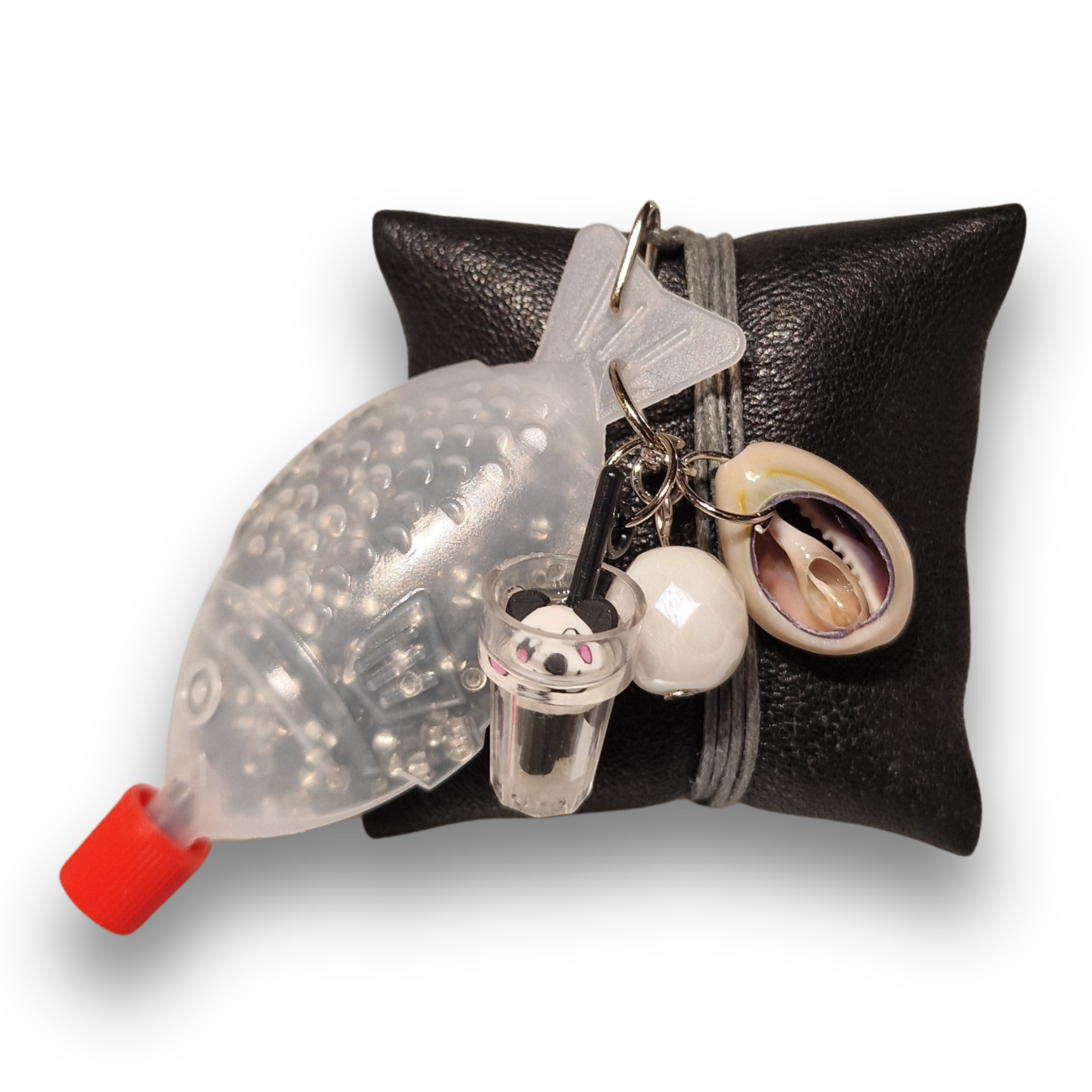 Sushi-Fisch mit Rocailles-Perlen gefüllt und Charm-Anhängern geschmückt. Das beschichtete Baumwollbändchen ist größenverstellbar (ca. 32-70cm).