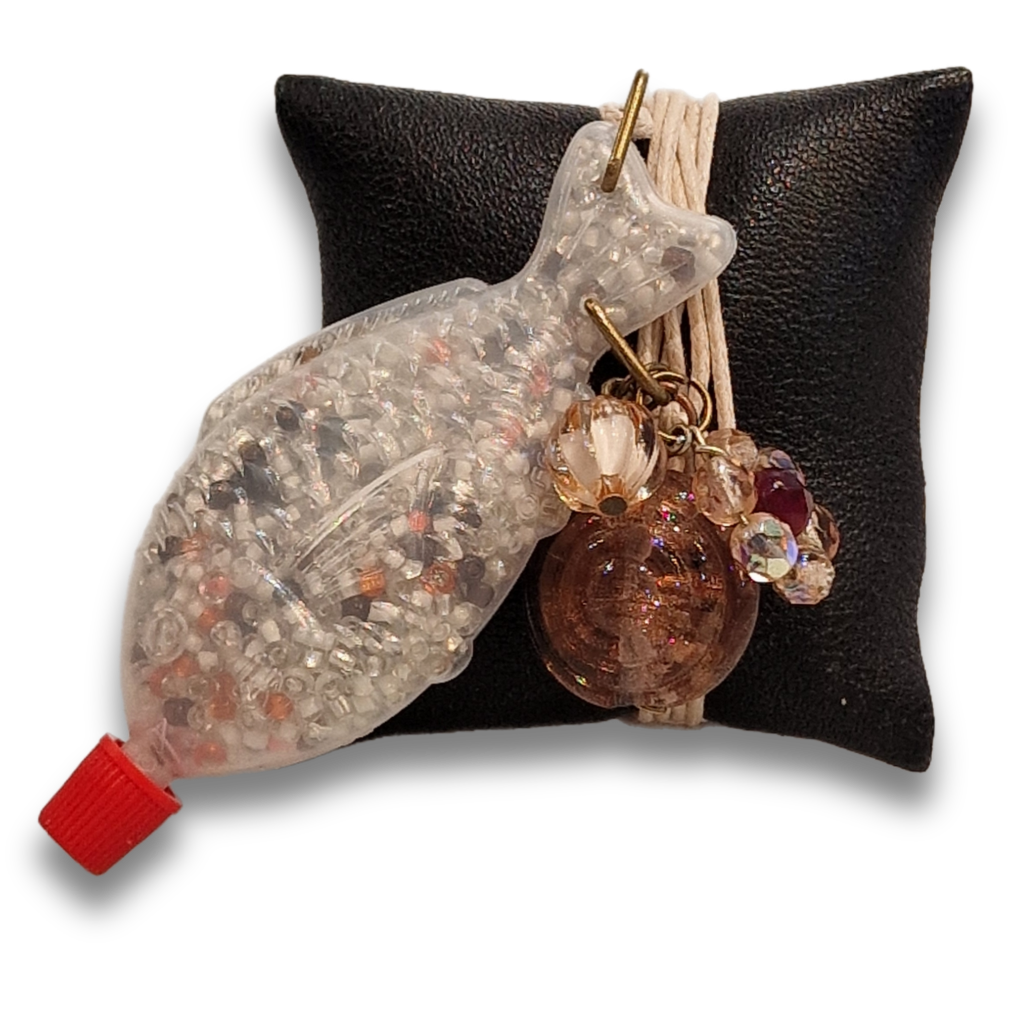 Sushi-Fisch mit Rocailles-Perlen gefüllt und Charm-Anhängern geschmückt. Das beschichtete Baumwollbändchen ist größenverstellbar (ca. 32-70cm).