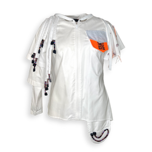Diese Bluse ist aus drei unterschiedlichen weißen Stoffen hergestellt, was für noch mehr Dynamik und Tiefe sorgt.