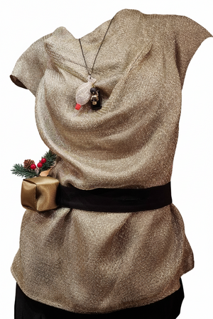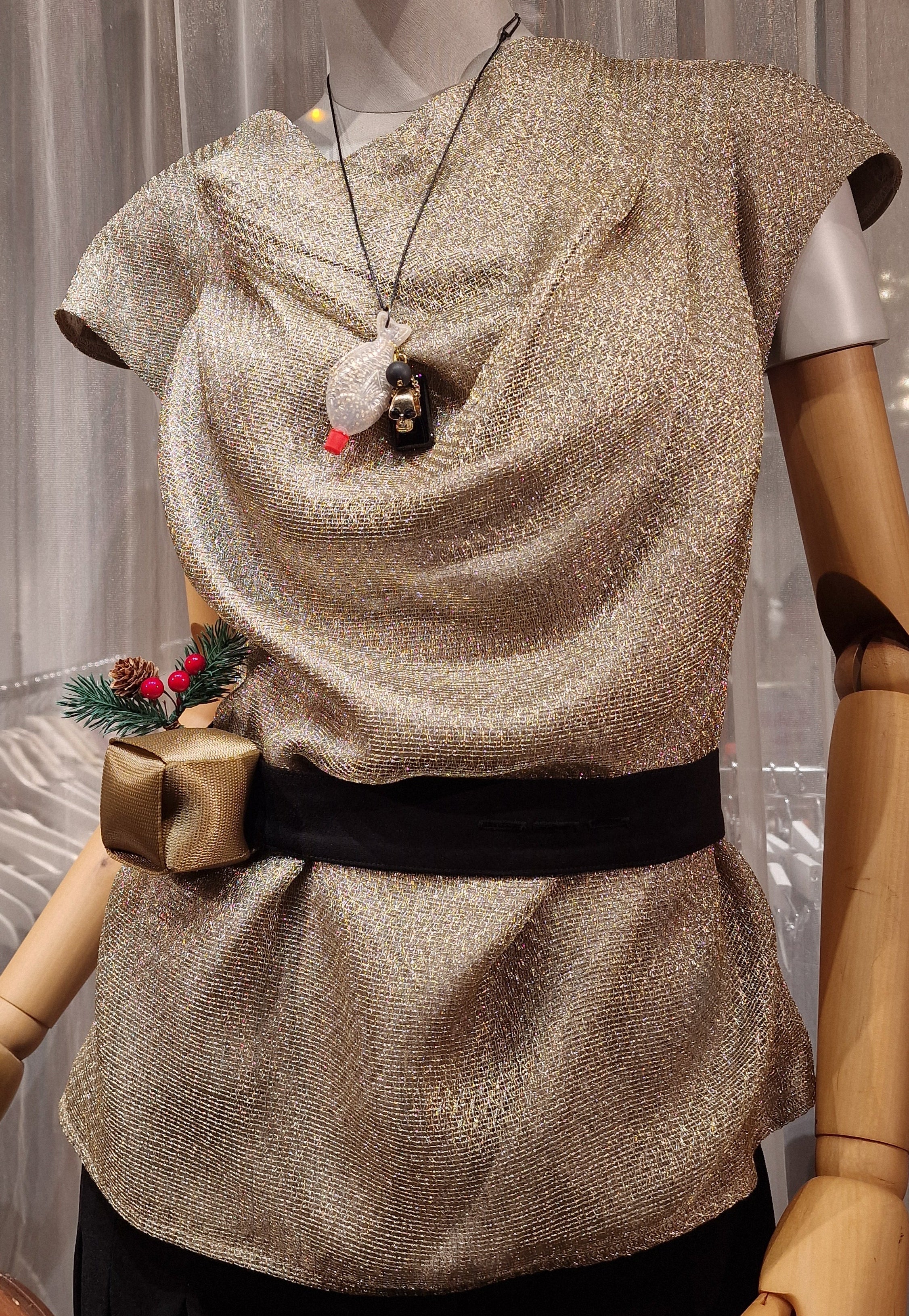 Sehr effektvoll sind die in die Schulterpartien beidseitig eingearbeitete Falten, der stark abgerundete Saum und die Flügelärmel wirken weiblich.