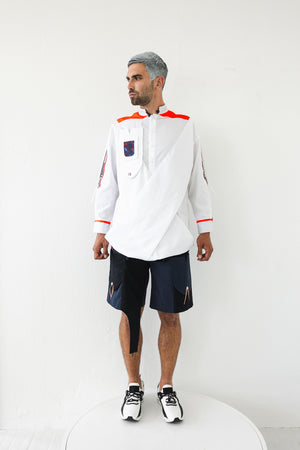 Cut Outs in den Tascheneingriffen, gestickte QR-Code Applikation und praktischer Bund mit Gummizug und Kordel runden das Ganze ab.