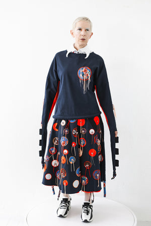 Der Rumpf schmückt eine große, kontrastierend applizierte und wattierte Brosche. Diese ist mit Kordelstoppern und buntem Ripsband verziert. Der leicht asymmetrische Saum wird mit einem gedrehten Schnur in Form gebracht. Die kontrastierende Schnürung ist über die Stickerei im Rücken platzier und harmoniert mit der bestickten QR-Code.