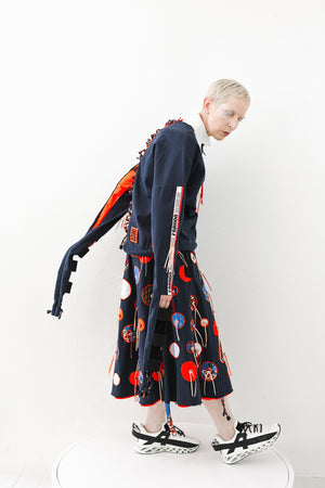 Die überlange Ärmel haben kontrastierende Rechteck- und Keileinsätze, Schnürungen, und kontrastierend eingefasste Nahtzugaben. Für eine Prise Ironie sorgt das aufgesteppte Fashion-Band. Dieses ist ebenso mit