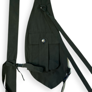Sie ist asymmetrisch gestaltet und verfügt über eine geräumige Blasebalgtasche.