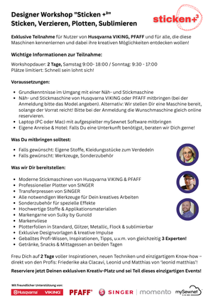 Je Termin stehen: 1 xHusqvarna VIKING Designer Epic 1, 2 x Husqvarna VIKING Designer Epic 2, 2 x Husqvarna VIKING Designer Epic 3, 1 x Husqvarna VIKING Designer Ruby 90, 1 x PFAFFIcon 1, 1 x PFAFF Icon 2 und 1 x PFAFF Performance 950 zur Verfügung - first come first served!