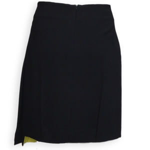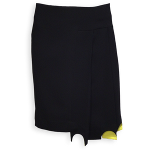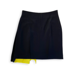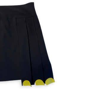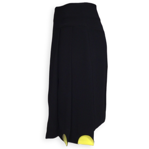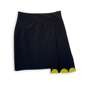 Dieser asymmetrische Rock befindet sich ständig in Bewegung und sieht bei jedem Schritt etwas anders aus: das liegt an kontrastierendem Falteninhalt und runden Aussparungen an den Faltenenden.