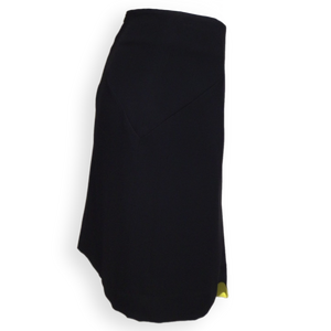 Ein schmales Schnittteil, in das vordere Abnäher eingearbeitet, sowie das Spiel mit den Längen runden das Ganze ab und betonen nochmals die Rockasymmetrie.