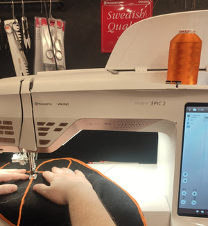 Unsere Top-of-the-line Maschinen von Husqvarna® VIKING® samt Zubehör, hochwertigen Stoffen und Markengarnen stehen Dir selbstverständlich dabei zur Verfügung!