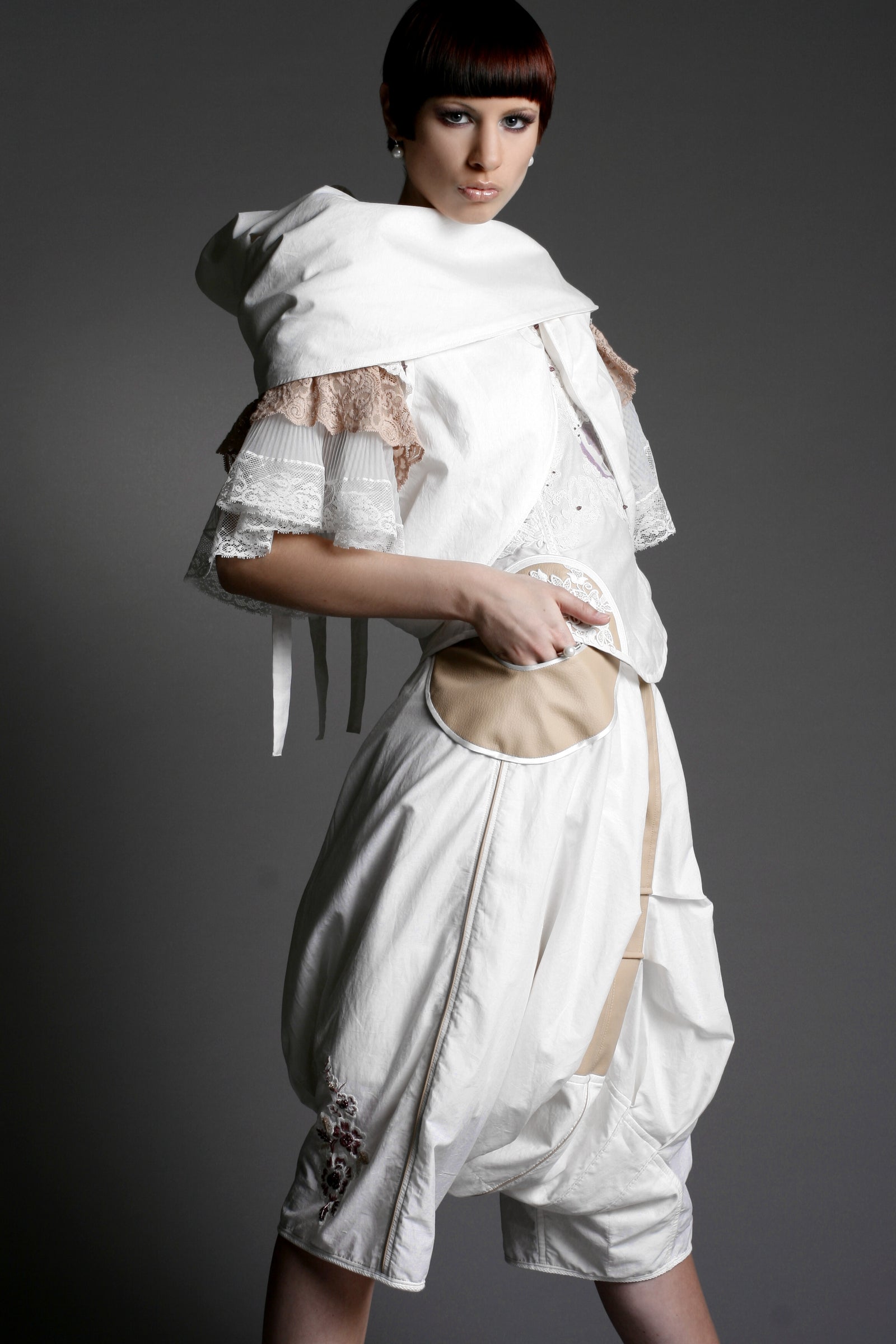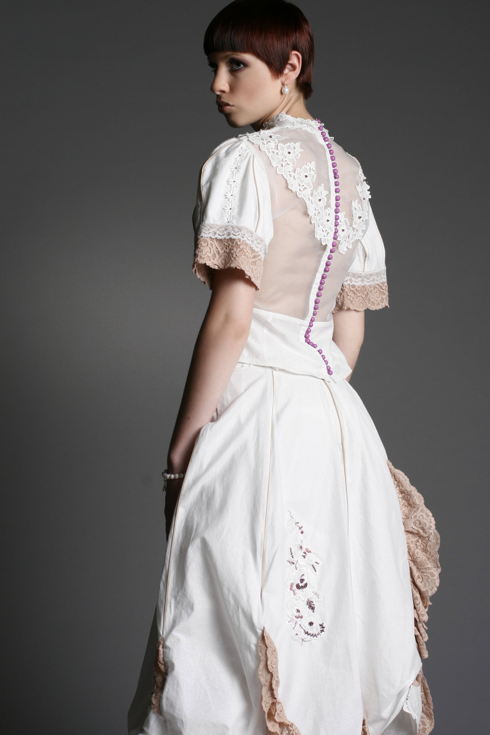 Das Weibliche wird durch die Schnittführung, unzählige Handstickereien, Applikationen und die Zierde aus der Strumpfhosenspitze unterstützt.