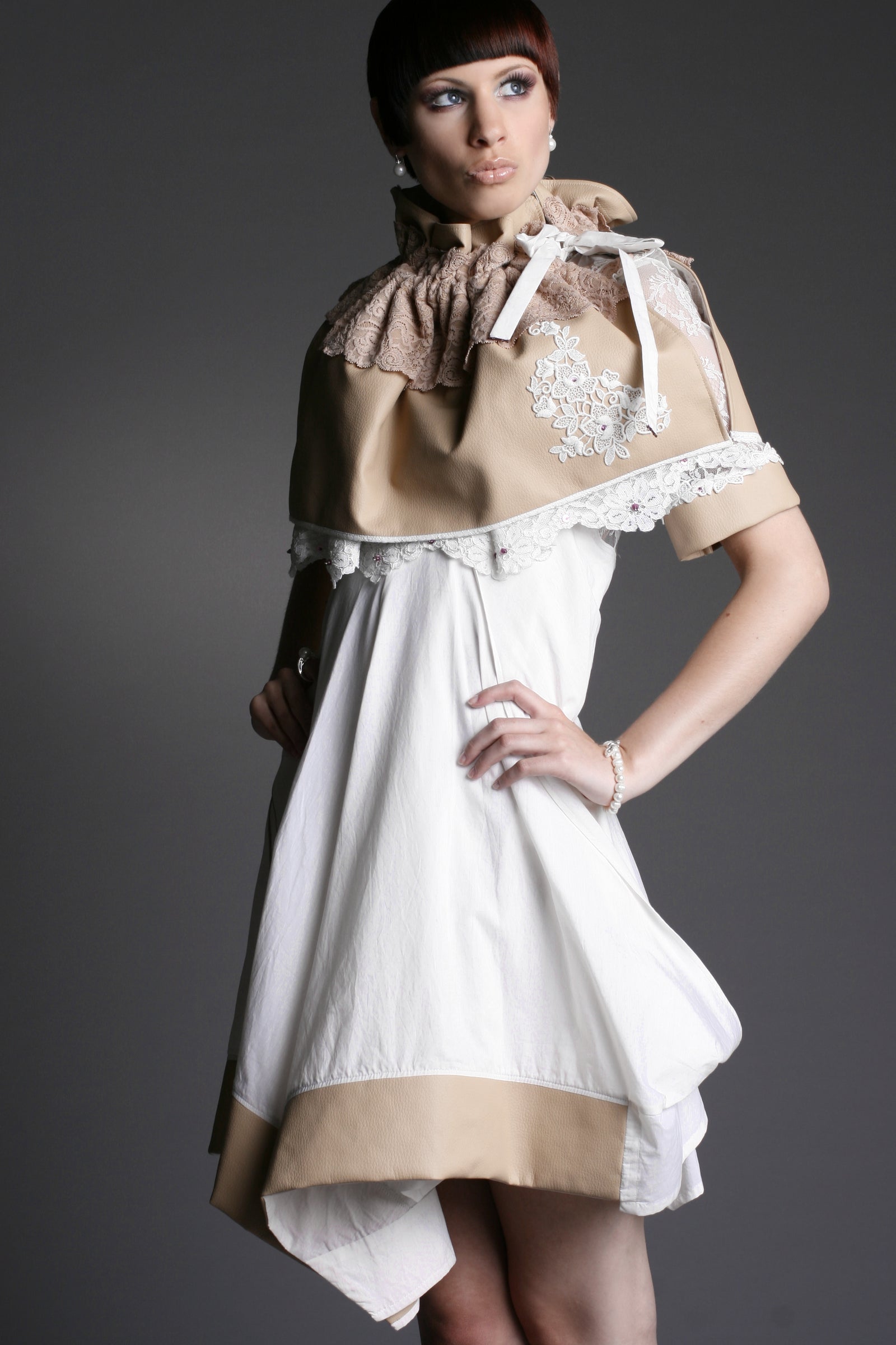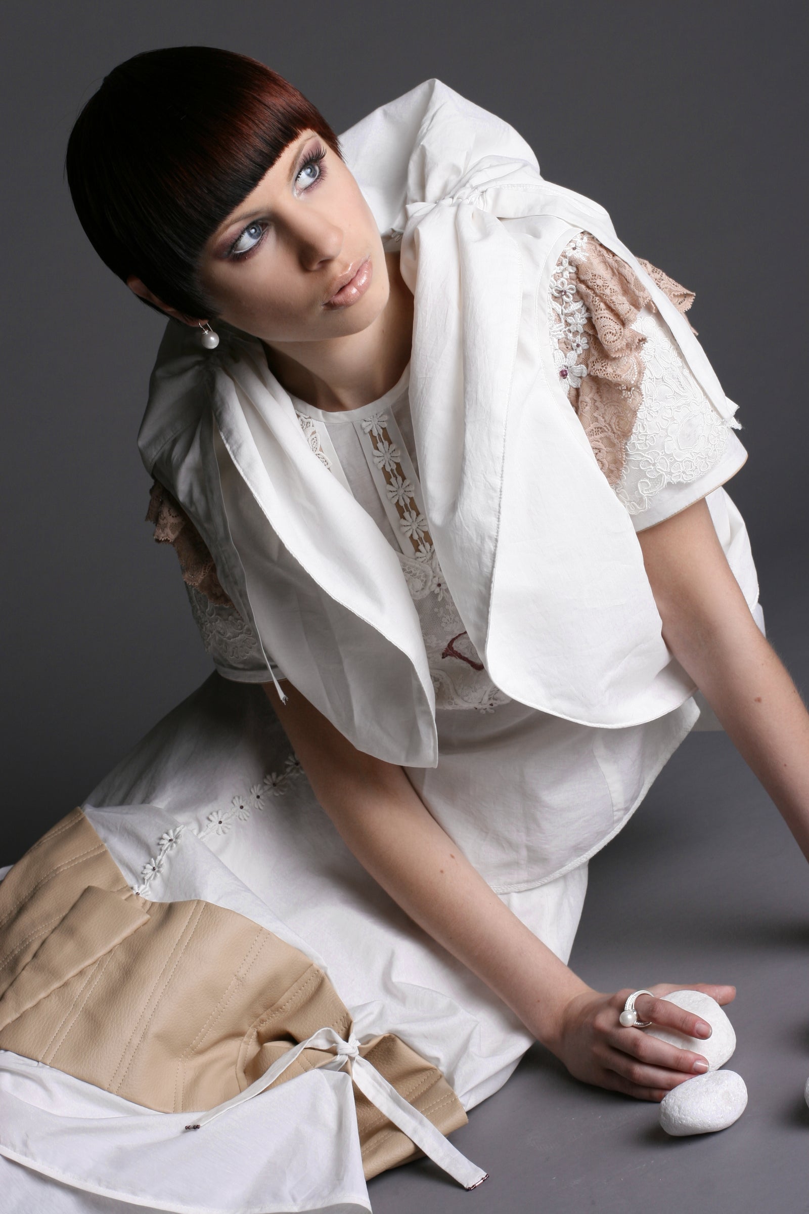Der  Kontrast von Frau und Mann, Stein und Vogel wird durch die Kombination von feinem Baumwollbatist, Spitze und Kunstleder erzielt.
