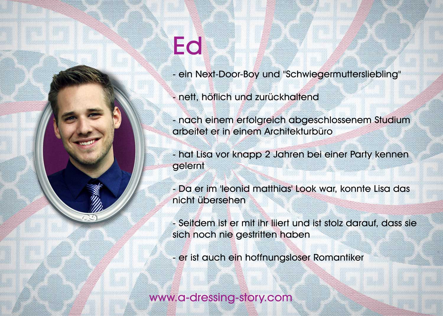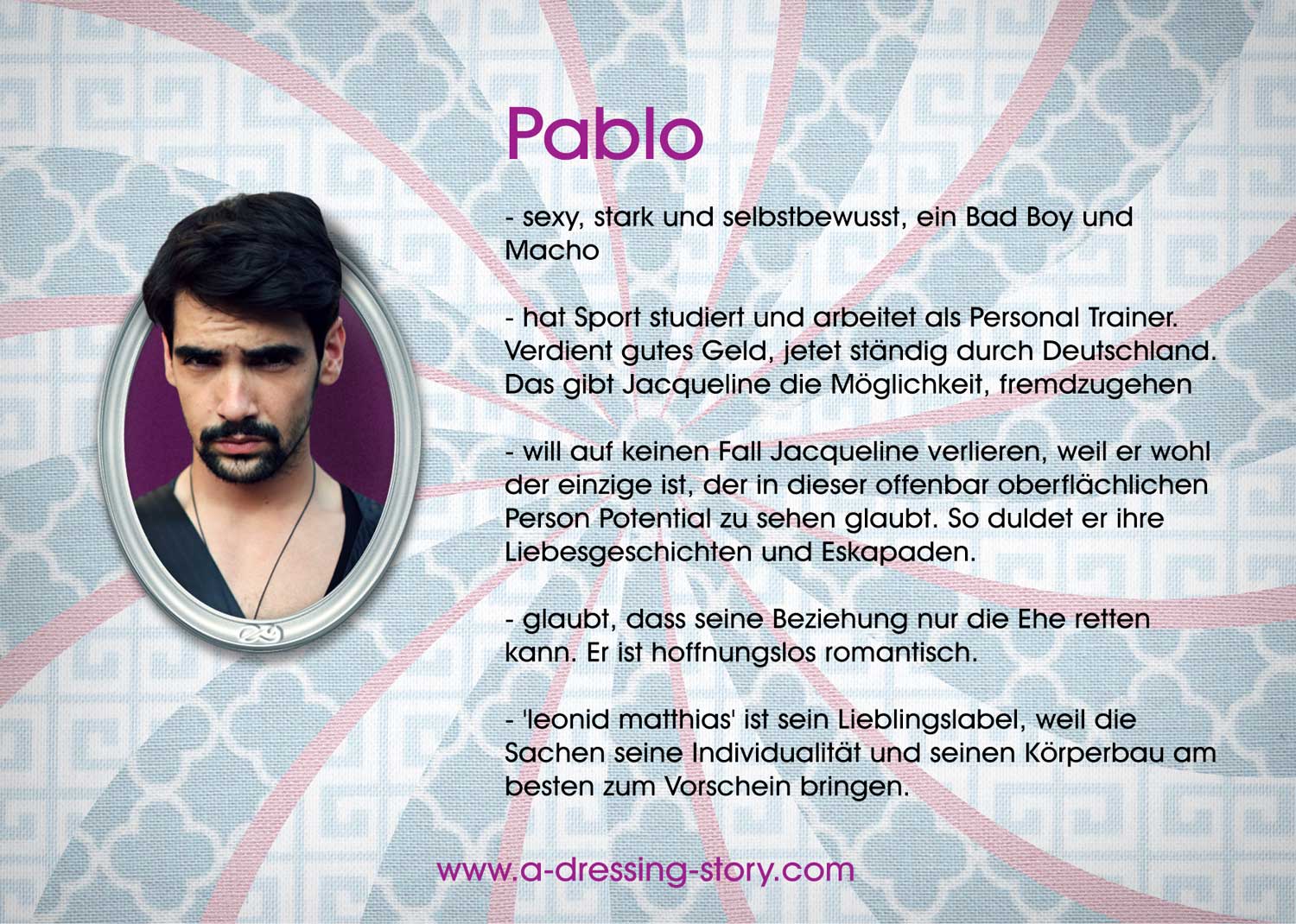 „a Dressing Story“ by 'leonid matthias' ist eine Liebesgeschichte, gepackt in kurzen Folgen (2-3 Minuten), die komisch und dramatisch zugleich sind. Hier trifft ein exzentrisches Fashion Victim auf ein Mauerblümchen, ein Macho auf einen Next-Door-Boy und Leonid auf Matthias. Höhen und Tiefen, Trennungen und Leidenschaft, Tränen und Momente des Glücks – ob fashionaffine Shopaholics, Modeinteressierte oder die Liebhaber der qualitativen Unterhaltung – bei dieser Sitcom kommen alle voll auf ihre Kosten, denn wenn Mode zum Vergnügen wird, entsteht die Unterhaltung der ganz besonderen Art!